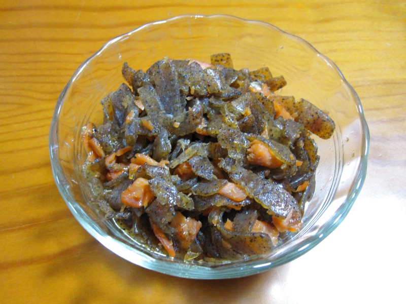 酒みりん醤油しょうが鷹の爪など入れて水分が飛ぶまで炒めて完成。
