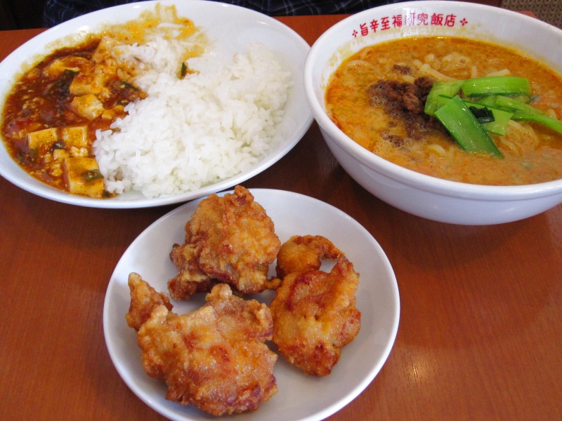 半マーボー・半担々麺・唐揚げの組み合わせ。辛うま。