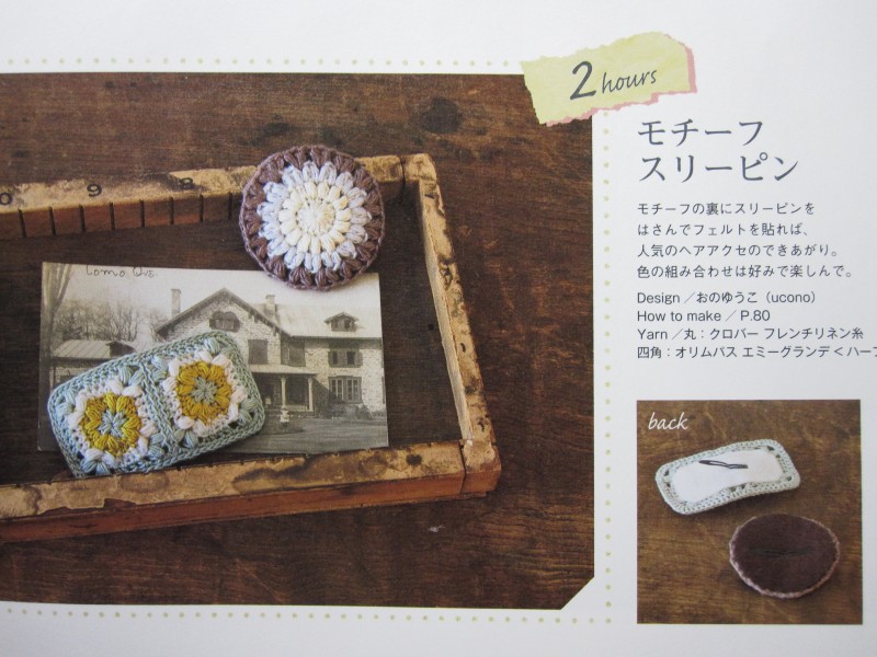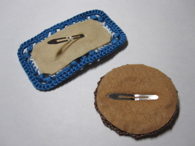 適当にモチーフを編んで、裏にスリーピンをつけるだけ。