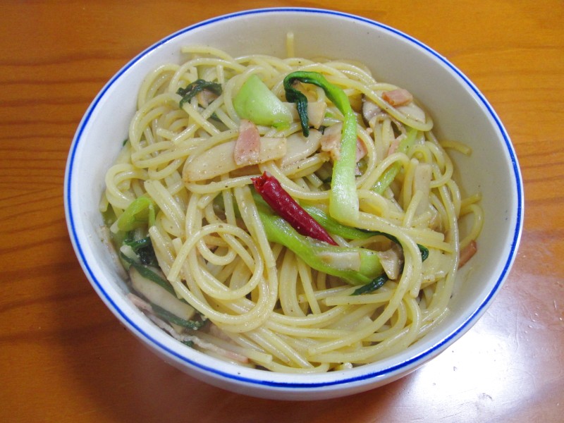 具は、ベーコン・エリンギ・チンゲン菜。ゴマ油で炒めて。
