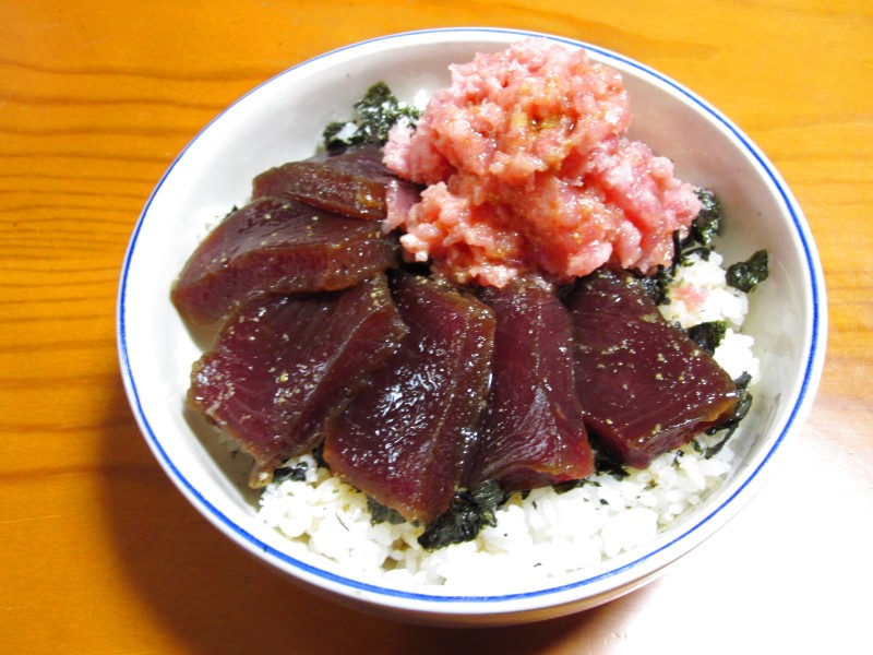 ネギトロと、マグロの刺身をヅケにしたのをトッピング。