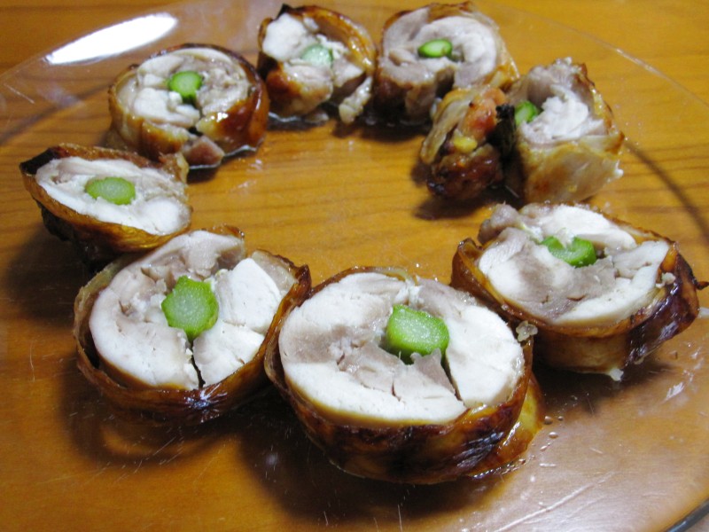 塩こうじで下味をつけた鶏肉を巻いて、オーブンで焼いていた。