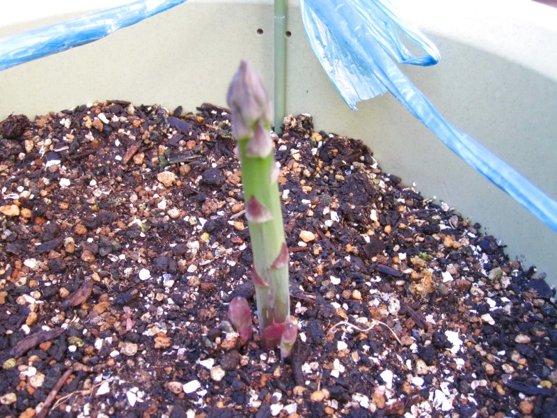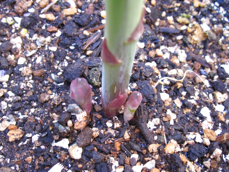 伸びたアスパラの、左側に太いの、右側に細いのが頭を出している!