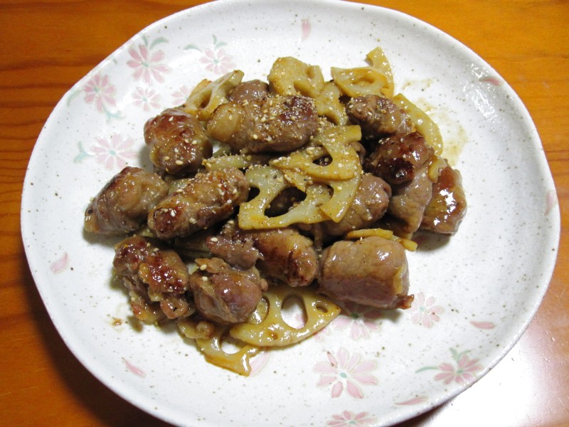 シャキシャキのレンコンと炒め合わせて、照り焼き風の味付け。