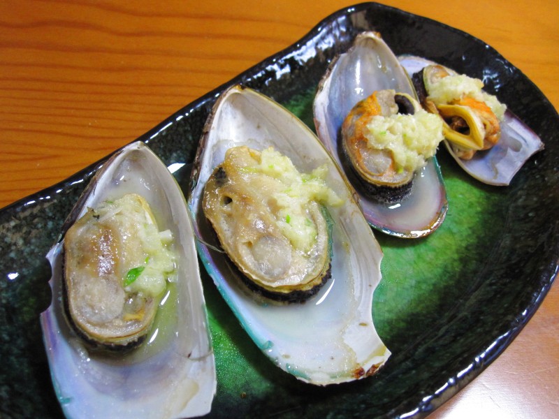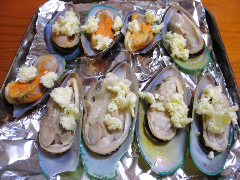 ↑下からもらった貝に、ガーリックバターをのせて焼く。