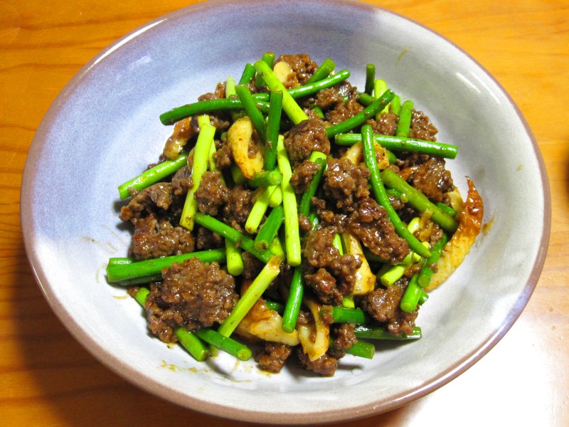↑にんにくの芽・ひき肉・ちくわの炒め物。