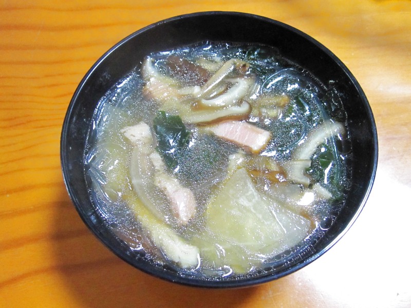 具は、ベーコン・しいたけ・大根・ワカメ・春雨。中華風の味付け。
