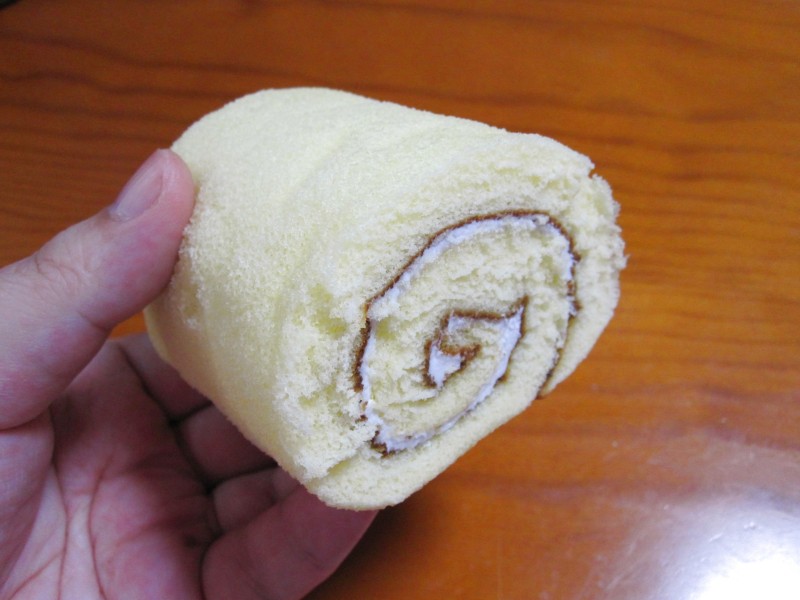 小さめサイズのロールケーキを、モリっと割って、夫の人と半分こ。
