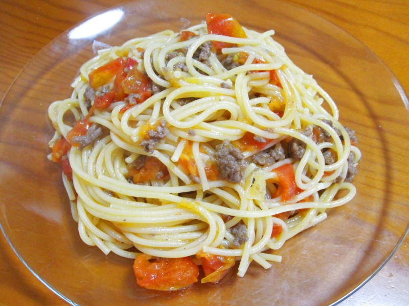 ↑ブランチ。ひき肉とフレッシュトマトのパスタ。