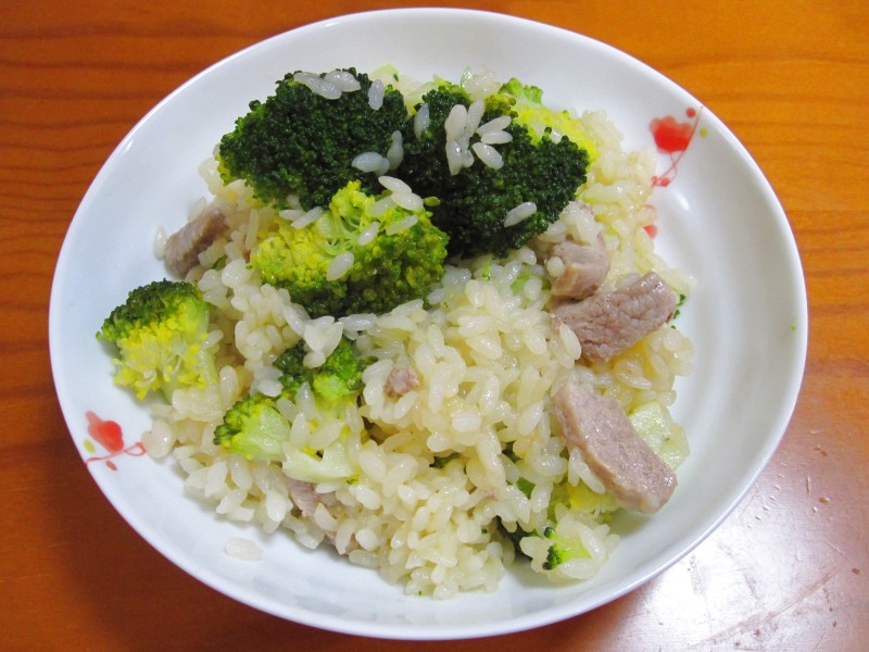 ↑朝ご飯。豚肉とブロッコリーのリゾット。