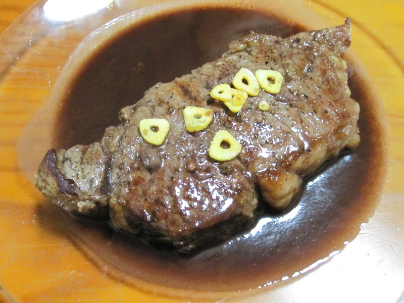 ↑ステーキ。フライドガーリックのせ。