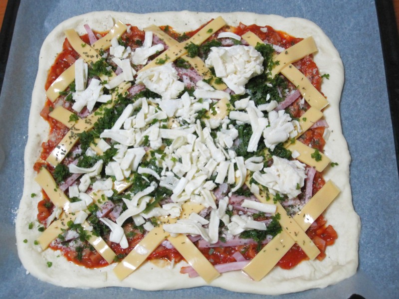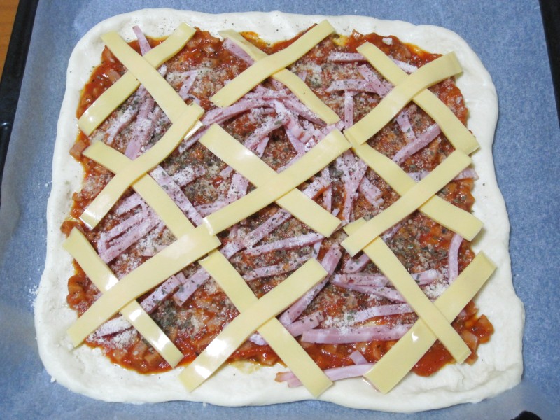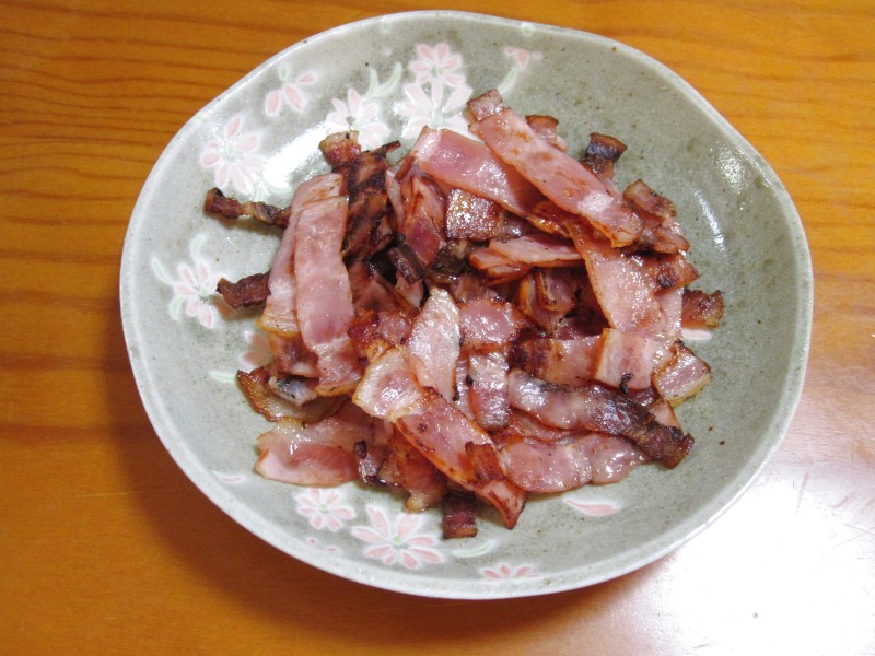 ベーコンの細切りを散らして、チェダースライスを細く切って並べた。