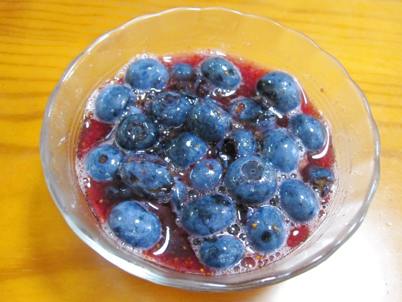 昨日のブルーベリーの残りを、半分つぶして砂糖と混ぜて。