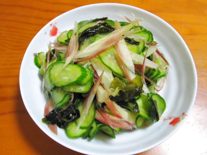 ↑夜ご飯。みょうがキュウリわかめサラダ。