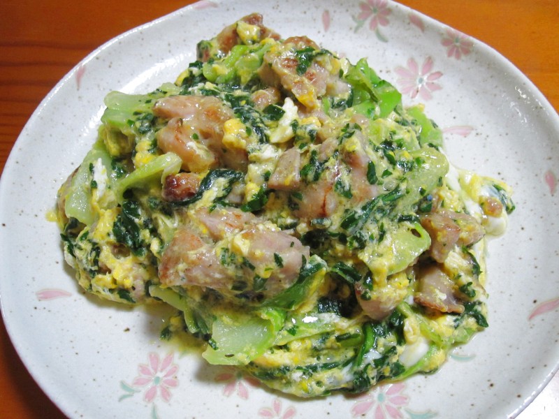 ↑鶏肉とチンゲン菜の玉子炒め。