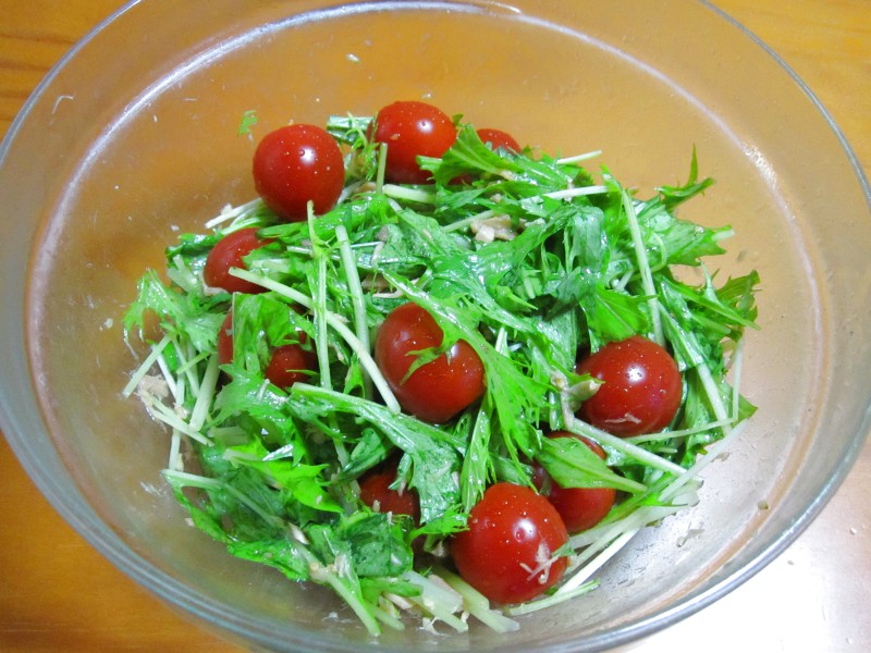 ↑水菜とミニトマトのサラダ。ミニトマトうまい。