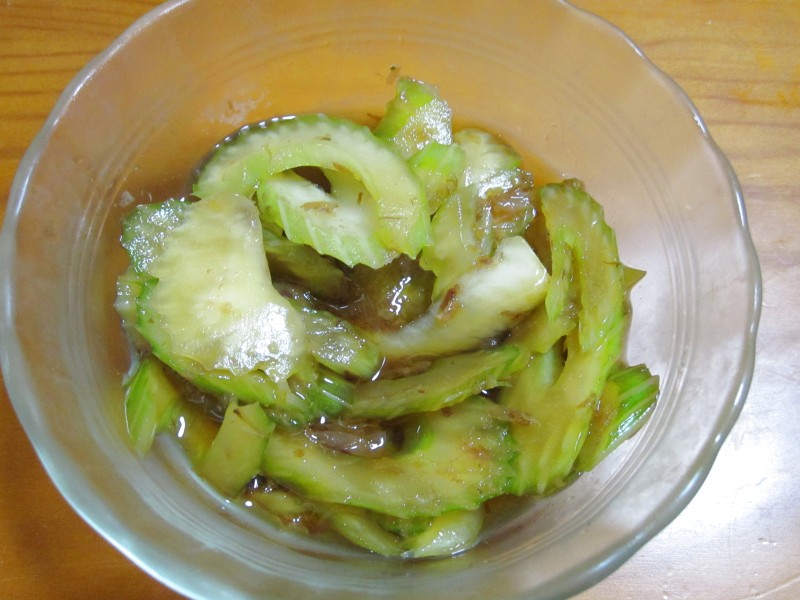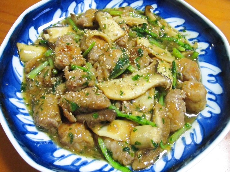 ↑豚肉・エリンギ・かぶの葉の炒め物。