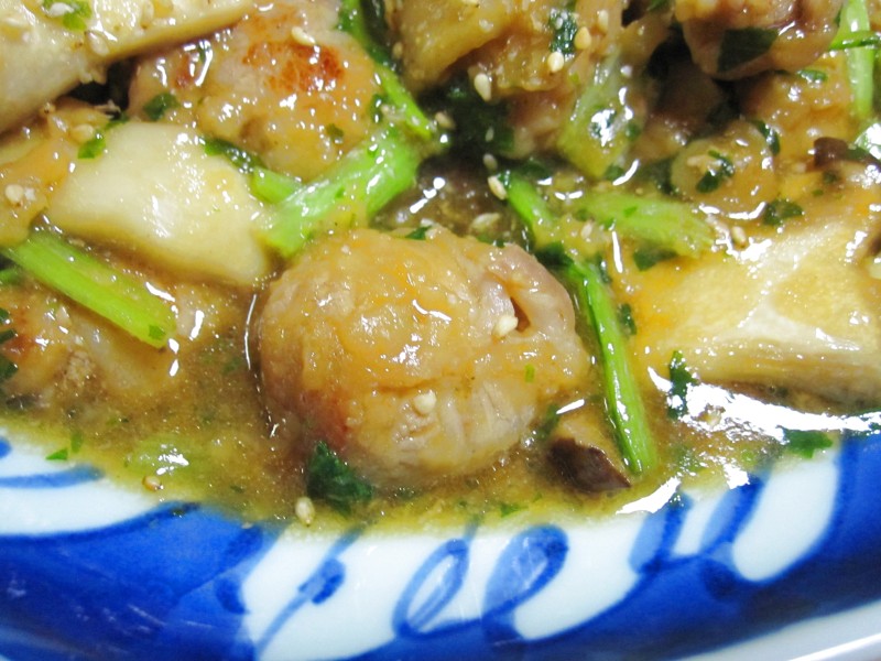 ↑薄切りの豚肉を、肉団子っぽく丸めて焼いた。