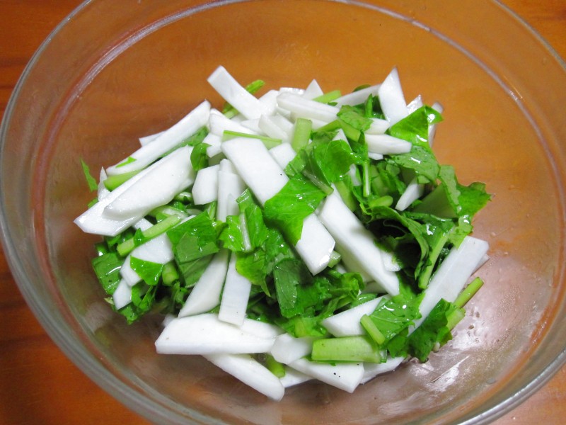 かぶは短冊切りにして、ざく切りの葉っぱと一緒に、塩ダレであえた。
