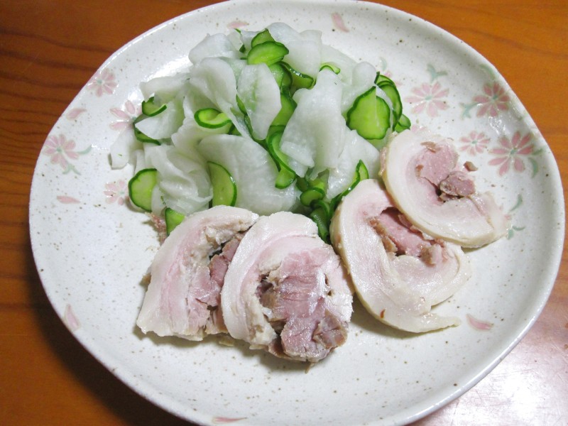 ↑塩もみ大根キュウリ、ゆで豚ラスト。