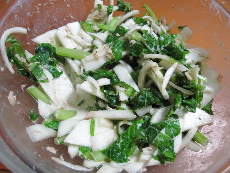 葉っぱはざく切り、むいた皮は千切り、実は短冊切りで、全部使用。