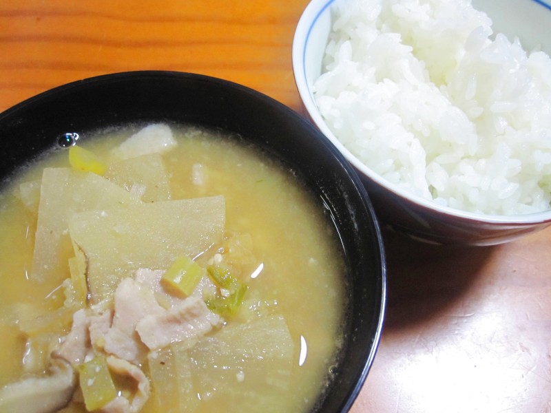↑夜ご飯。豚汁・ご飯。豚汁、夫の人にとても好評。