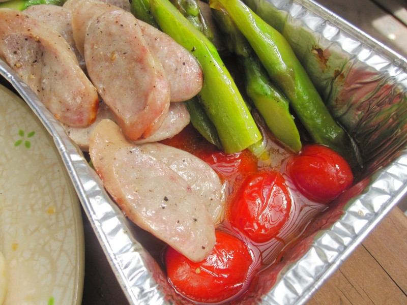 ↑ホイル蒸し、完成~。ミニトマト・アスパラ・ソーセージ。