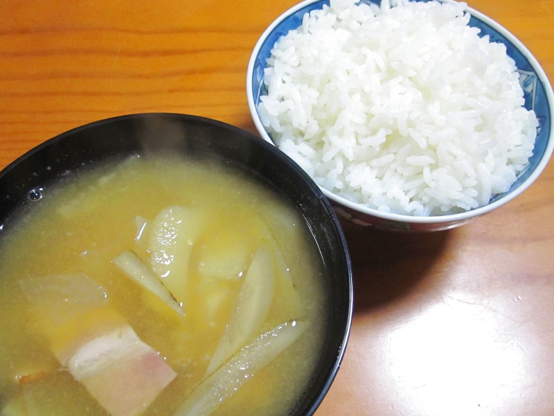 味噌汁は、大根・ジャガイモ・ゴボウなど根菜たっぷりの豚汁風。