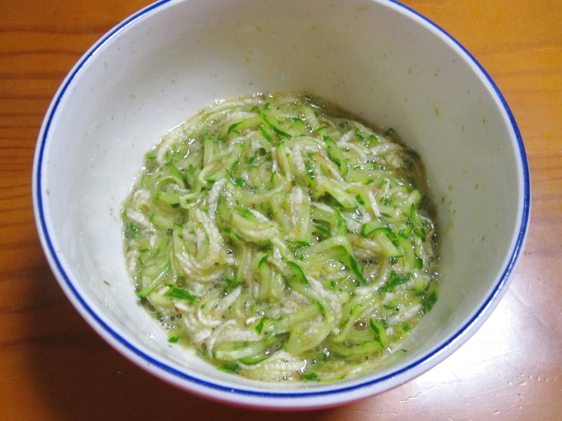 ↑長芋とキュウリの千切り、おかか柚子ポンあえ。