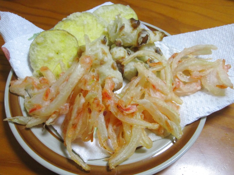 サツマイモ天・ちくわ天・桜エビと玉ネギのかき揚げ。