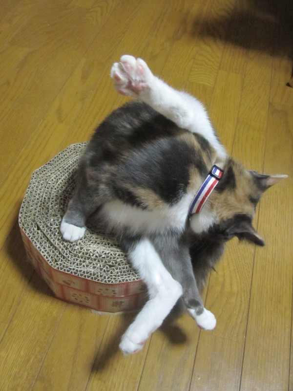 はすのお手製段ボール爪とぎが、だいぶ小さく見えてきた。