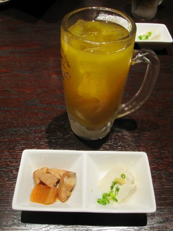 ↑マンゴーサワー?と、お通し。煮物と冷奴が一口ずつ。