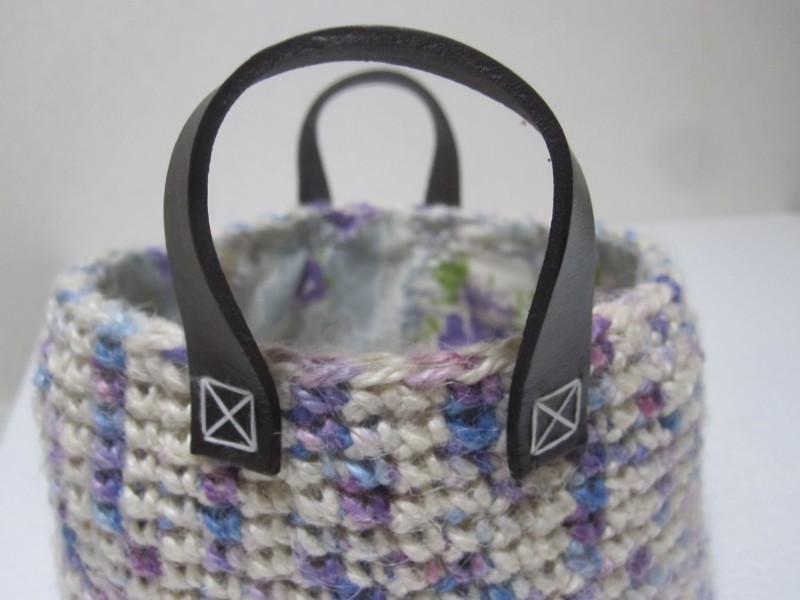 ↑短い皮の持ち手を、□と×に縫ってとめた。