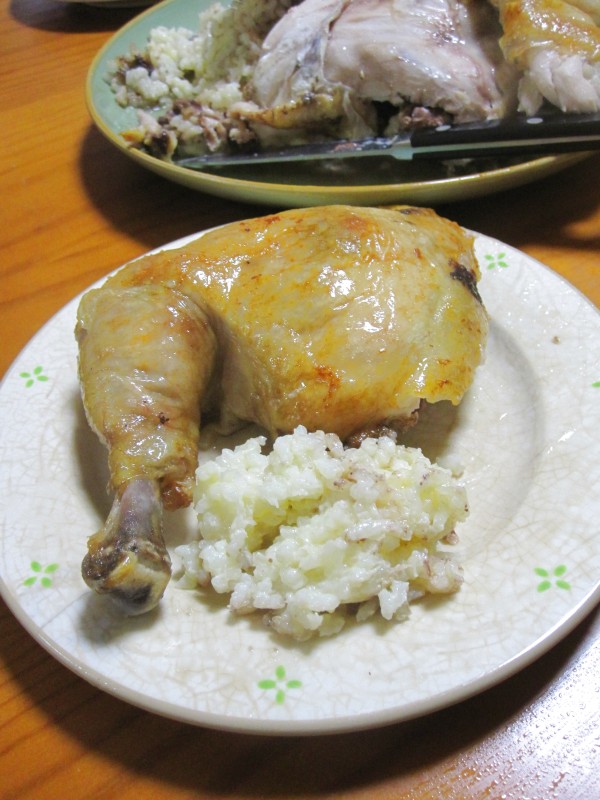 ↑チキンを切り分けて、とりあえずもも肉&リゾット。
