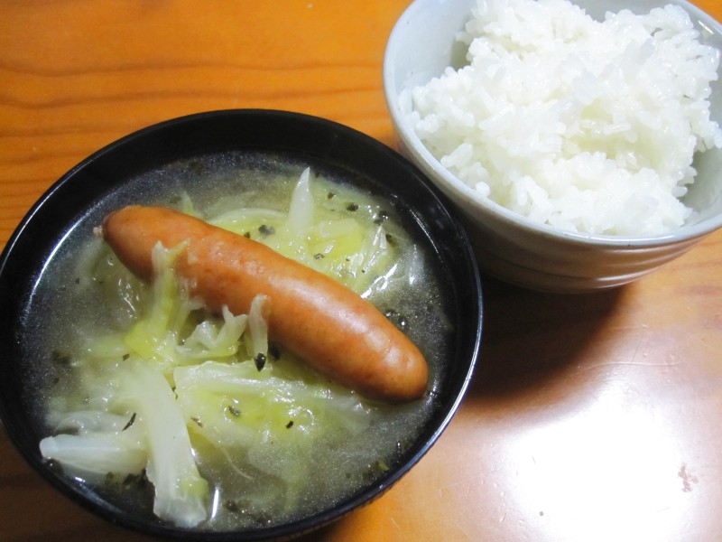 ↑夜ご飯。キャベツとウインナーのスープ・ご飯。