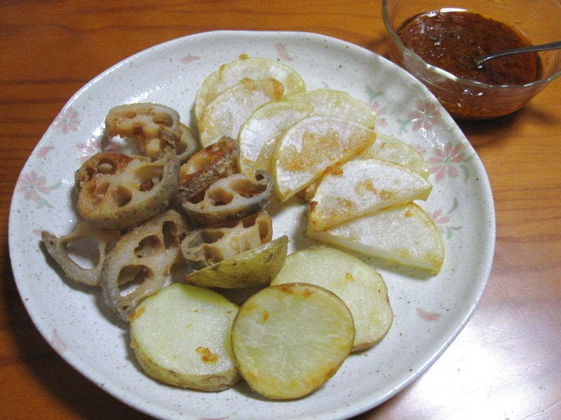 ↑根菜ソテー。BBQソースで。レンコン・大根・ジャガイモ。