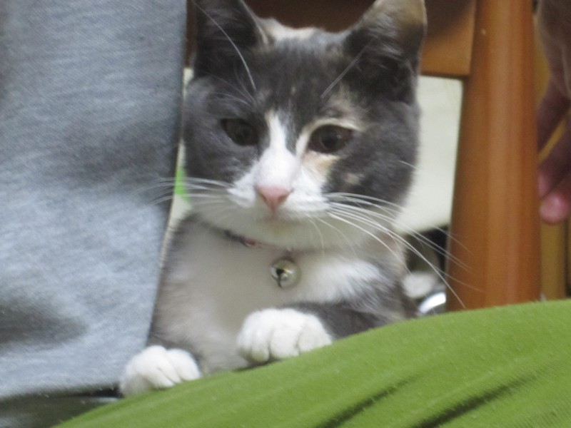 夫の人のひざへ乗ろうかどうか ためらい中。