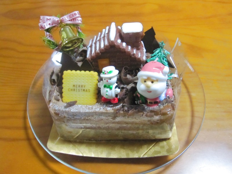 飾りを少しよけて、ケーキを4つ切りにして、今日半分、明日半分。