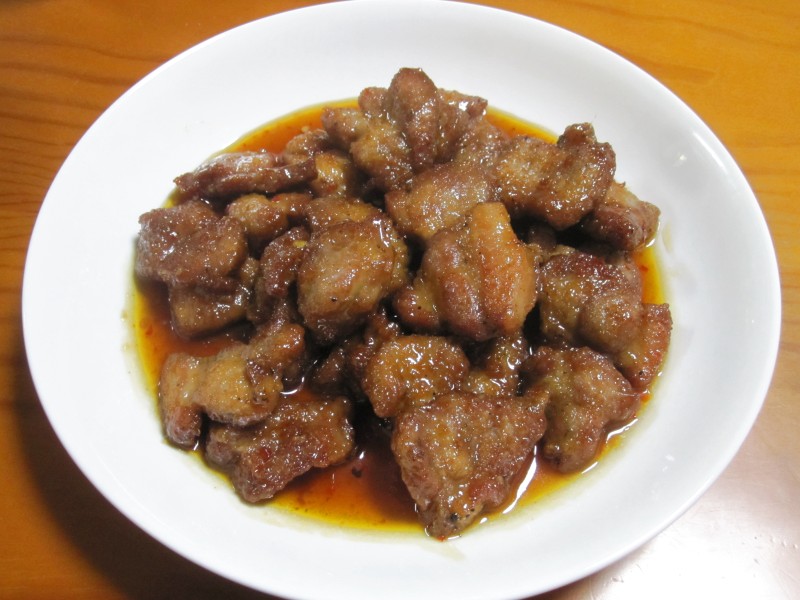 豚肉は一口大に切って、小麦粉をまぶして揚げて。