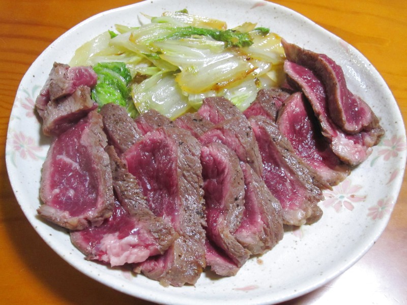 ↑夫の人特製・牛のたたき風&白菜くったり炒め。