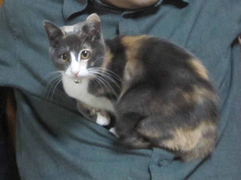 椅子にふんぞり返って座る夫の人の、お腹の上でくつろいでいる。