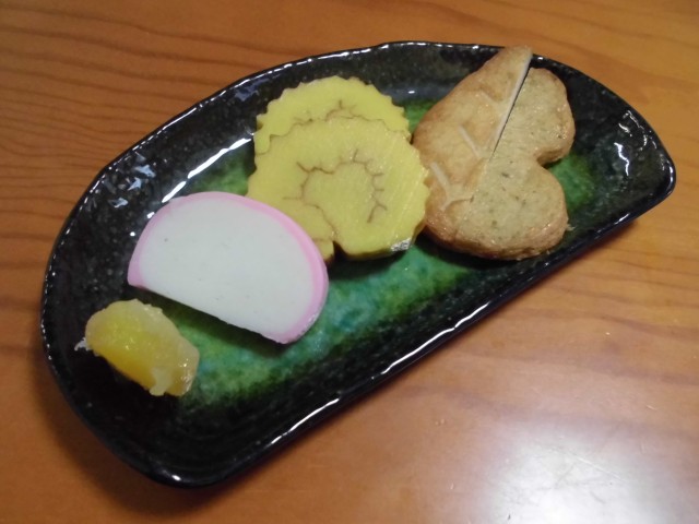 ↑おせちプレート。栗きんとん・かまぼこ・伊達巻・あげかま。