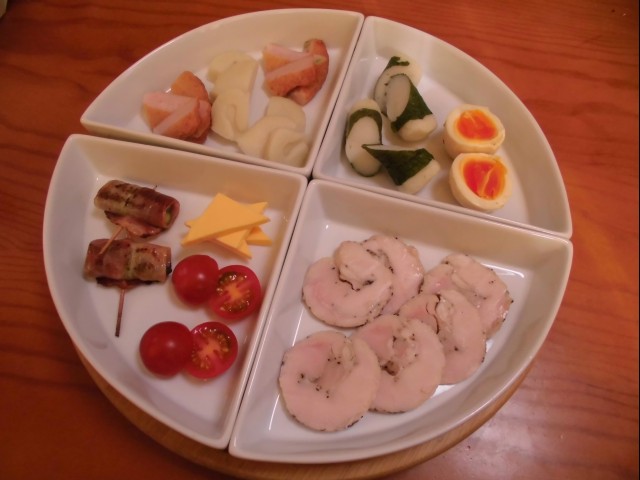 手前:アスパラベーコン・チーズ・ミニトマト・鶏ハム。