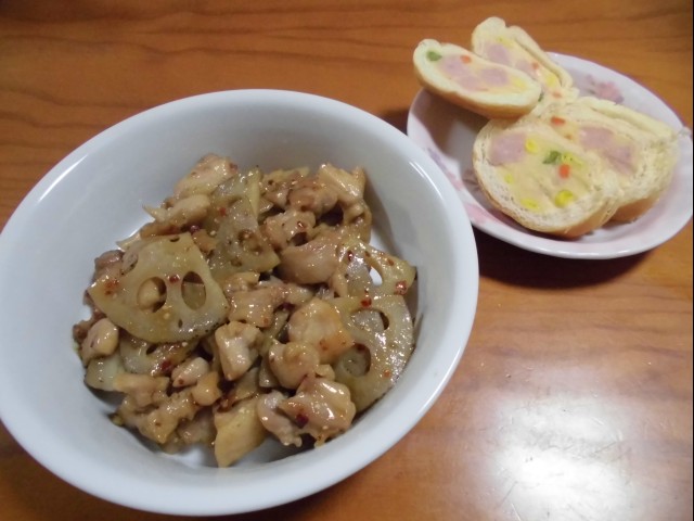 ↑鶏肉とレンコンの炒め物・下からもらったチーズパン。