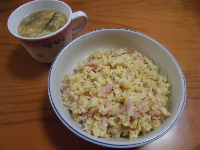 ↑夜ご飯。味噌スープと、ベーコン玉子チャーハン。