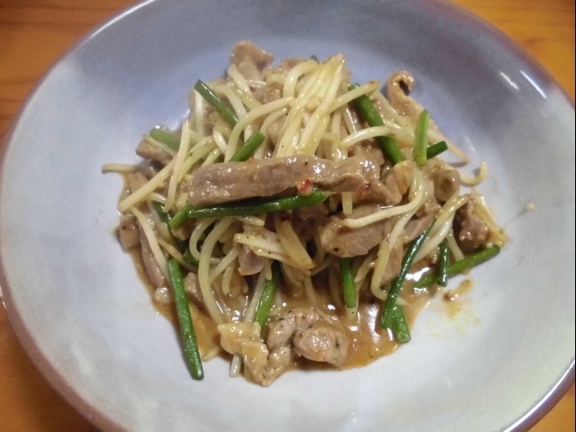 ↑豚肉もやしニンニクの芽の炒め物。