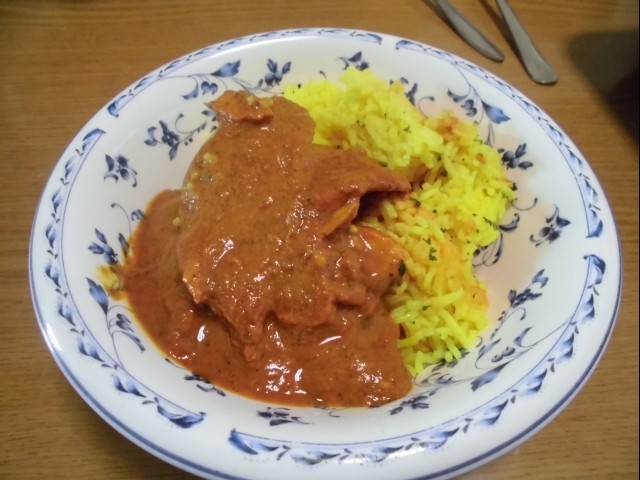 でっかいパックに、細長い米の黄色いご飯と、カレーがたっぷり。