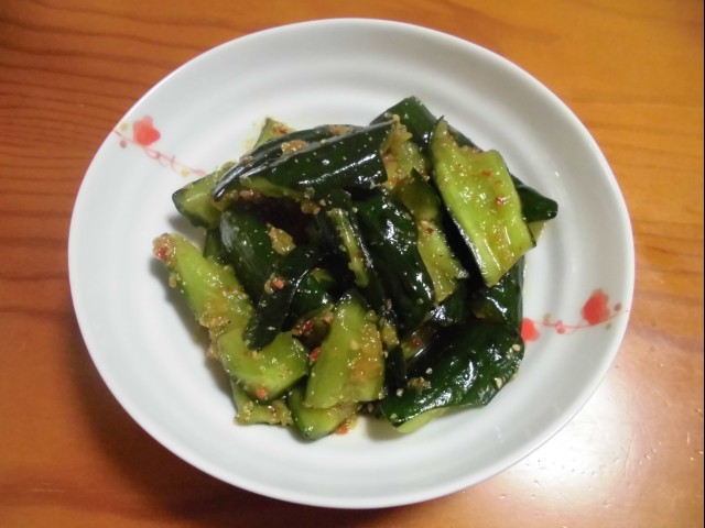 ↑キュウリのピリ辛浅漬け。
