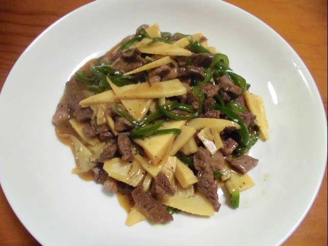 ↑ちょっとずつ残った 牛肉・タケノコ・ピーマンで、炒め物。