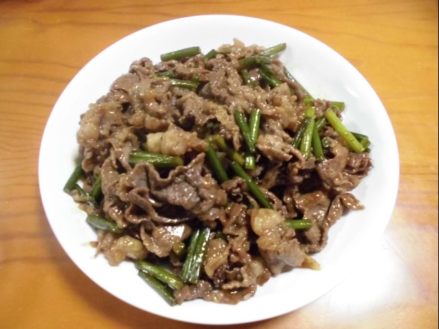 ↑牛肉とにんにくの芽の炒め物。